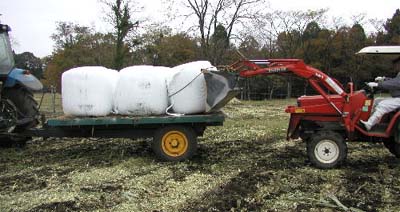 トラクタ後部にラップサイロの質量に見合ったバラストを装着し、急な旋回等は避ける。作業の安全性確保については十分に配慮する。