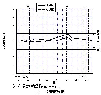 イタリアンライグラス、バヒアグラスの輪換放牧時に、補助飼料として稲ワラのみを給与すると、成雌牛の維持に要するTDNの104.6%を摂取でき、栄養度は適正に維持される(表1、図1)。