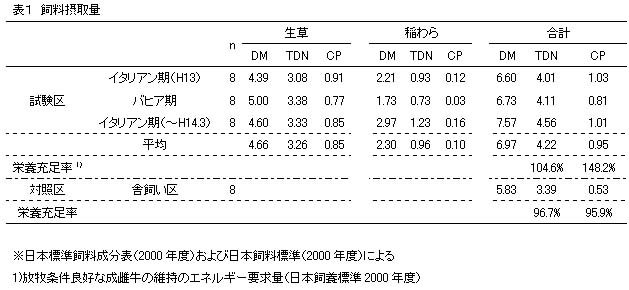 - 黒毛和種繁殖雌牛16頭を供試し、試験区8頭はイタリアンライグラス草地6,710m2およびバヒアグラス草地7,250m2を用い周年輪換放牧を行った。放牧時間は午前9時から午後3時までの6時間、その他の時間は舎飼いとし、濃厚飼料無給与で補助飼料は稲ワラのみとした。対照区は舎飼いし、トウモロコシサイレージおよび乾草を維持に必要なTDN量を充足するよう給与した。また、試験区・対照区共に分娩後3日で親子分離を行った。