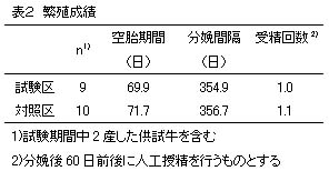 黒毛和種繁殖雌牛を用いた早期親子分離技術は、放牧と補助飼料の稲ワラのみでも1年1産が可能である(表2)。