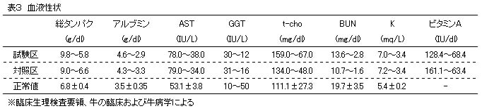 血液性状は正常値で推移し、疾病・下痢等の発生もなく、健康な繁殖牛飼養管理が可能である(表3)。