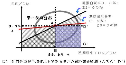 図1 乳成分率が平均値以上である場合の飼料成分領域(ABC'D')