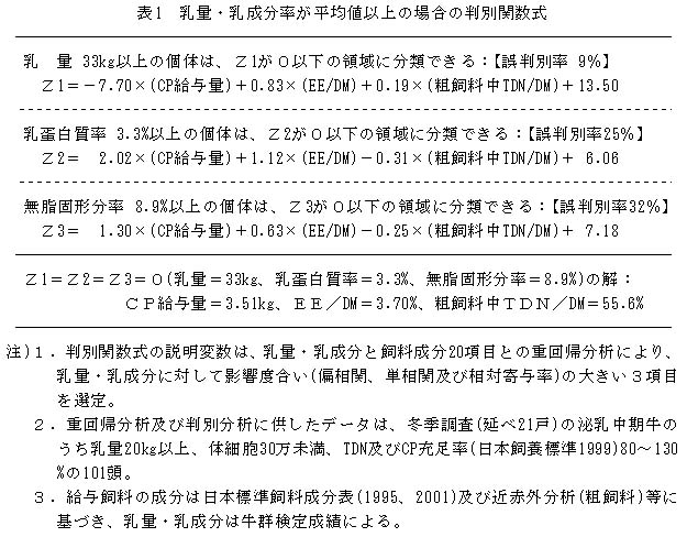 表1 乳量・乳成分率が平均値以上の場合の判別関数式