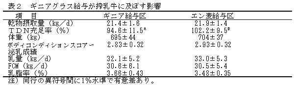 表2 ギニアグラス給与が搾乳牛に及ぼす影響