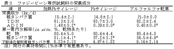 乳生産量および乳成分に有意な差は認められない(表2)。マメ科牧草試験:代替えの可能性と非分解性タンパク質の検討のためサイレージ開封前に摂氏80度3日間加熱し、ホルスタイン種6頭を用い、ラテン方挌法によりPbサイレージ、加熱PbサイレージおよびAL乾草を供試混合飼料中の14.0%(乾物中)を給与し比較する(栄養成分は表3)。