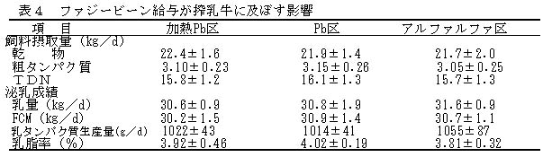 表4 ファジービーン給与が搾乳牛に及ぼす影響