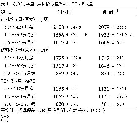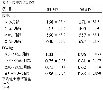 制限区における14.2〜20.6ヵ月齢のDGは0.75kgとなり、飽食区のDG0.81kgと比べ低い値となるが24.3ヵ月齢時の体重に差はない(表2)。