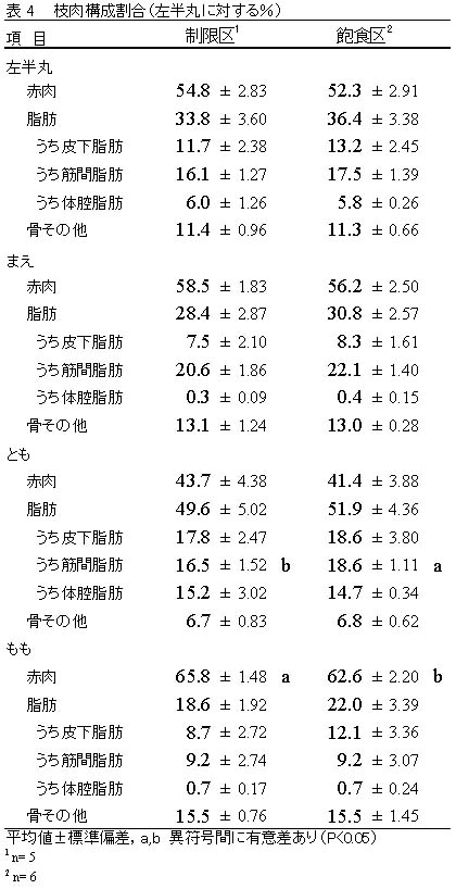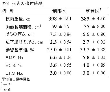 制限区では飽食区と比べ胸最長筋面積が大きく、ばらの厚さが厚く、皮下脂肪の厚さが薄く歩留基準値も優れる(表3)。