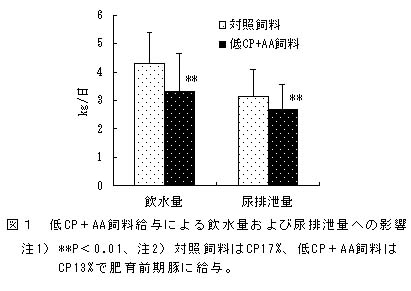通常の飼料(CP17%)を給与した豚に比較して、CP含量を下げ不足するアミノ酸(リジン、メチオニン、トレオニン)を添加した低CP+AA飼料(CP13%)を給与した豚では飲水量(23%)および尿排泄量(15%)が低減する(図1)。