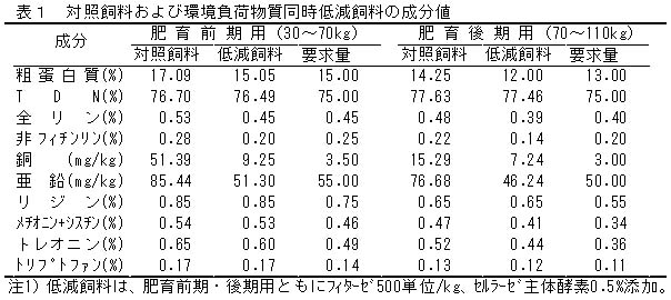 表1 対照飼料および環境負荷物質同時低減飼料の成分値