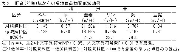 低減飼料を肥育(前期)豚に給与すると、通常の飼料に比べ窒素、リンおよび銅排泄量をそれぞれ21、23および79%低減することができる。また、ふん、尿および亜鉛排泄量は有意差は認められないものの低減する傾向にある(表2)。