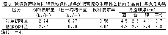 表3 環境負荷物質同時低減飼料給与が肥育豚の生産性と枝肉の品質に与える影響