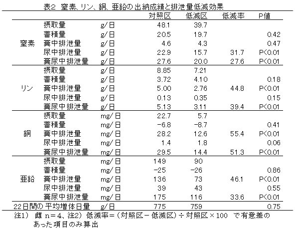 表2 窒素、リン、銅、亜鉛の出納成績と排泄量低減効果