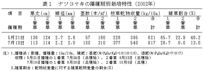 表1 ナツコマキの播種期別栽培特性(2002年)