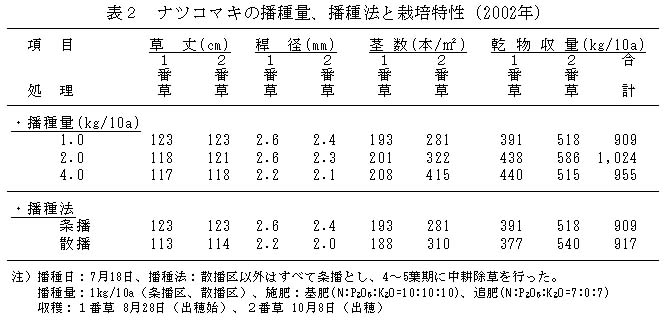 表2 ナツコマキの播種量、播種法と栽培特性(2002年)
