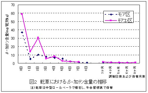 血中ビタミンA制御の肥育経営で注目されている粗飼料中のβーカロテン含量については、飼料イネ乾草調製時の間に、稲ワラ並に減少し保管の間も漸減する(図2)。