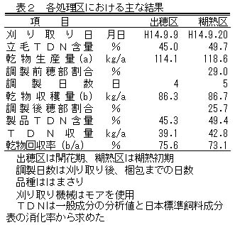 飼料イネを乾草調製するとき糊熟期でモアを利用し刈取り収穫すると調製時のロス割合は高くなるが、飼料中TDN含量とTDN収量は高まる(表2)。