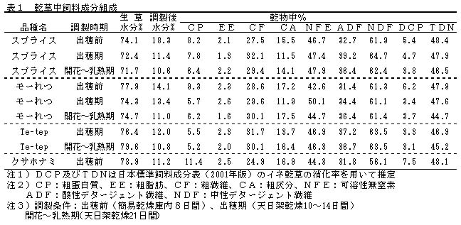 飼料イネ乾草は、熟期がすすむにつれて、粗蛋白質、DCP及びTDNは減少し、ADF及びNDFはやや増加する傾向にある(表1)。