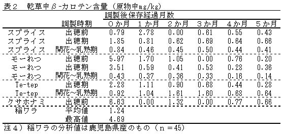 出穂前及び出穂期刈り乾草の調製直後のβ-カロテン含量は、稲ワラより高い傾向にあるが、調製1〜2ヵ月後には稲ワラと同程度まで低下している。開花〜乳熟期刈りのβ-カロテン含量は調製直後から保管期間を通して、稲ワラの範囲内にある(表2)。