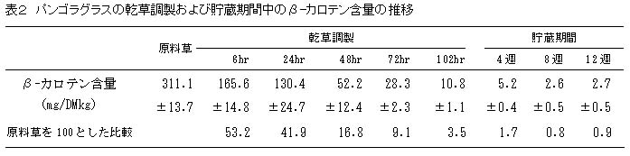 表2 パンゴラグラスの乾草調製および貯蔵期間中のβ-カロテン含量の推移