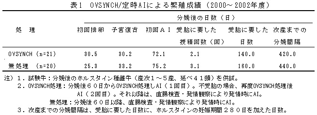 表1 OVSYNCH/定時AIによる繁殖成績(2000〜2002年度)