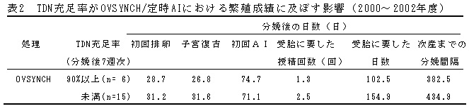 表2 TDN充足率がOVSYNCH/定時AIにおける繁殖成績に及ぼす影響(2000〜2002年度)