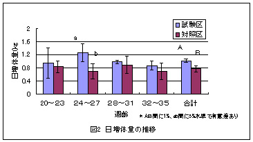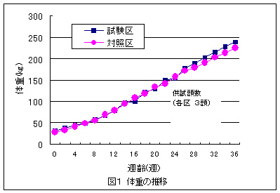 体重及び日増体量については良好な発育を示し、一日増体量は20から36週齢までは有意に優れる。(図1、図2)