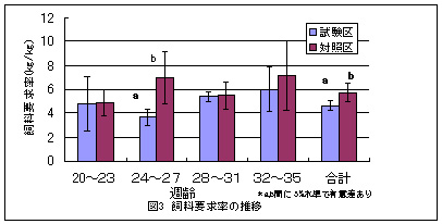 摂取した乾物当たりの飼料要求率は給与区において有意に低下する。(図3)