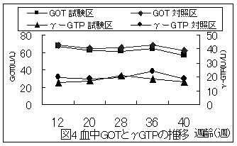 供試牛の血液成分では、GOTは100IU/L以下、γ-GTPは30IU/dl以下であり正常値の範囲である。(図4)