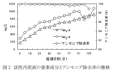 図2 活性汚泥液の窒素成分とアンモニア除去率の推移