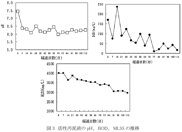 図3 活性汚泥液のpH、BOD、MLSSの推移