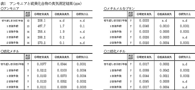 表1 アンモニアと硫黄化合物の臭気測定結果