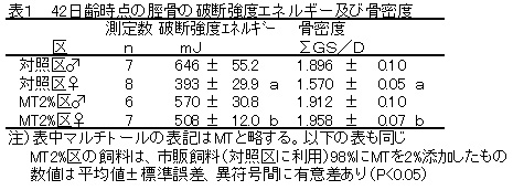 マルチトール2%添加区(MT2%区)の脛骨の破断強度は42日齢時点で、対照区より有意に向上する(表1)。