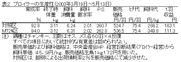 表2 ブロイラーの生産性(2003年3月19日〜5月13日)