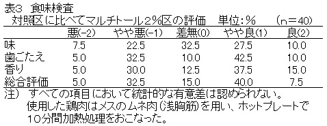 55日間飼育した肉用鶏は生産された肉の食味に差はない(表3)。