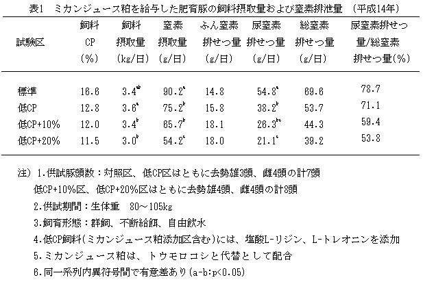 表1 ミカンジュース粕を給与した肥育豚の飼料摂取量および窒素排泄量(平成14年)