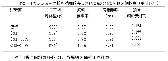 表2 ミカンジュース粕を添加給与した肥育豚の発育成績と飼料費(平成14年)