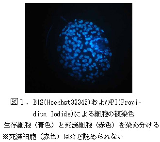 図1 BIS(Hoechst33342)およびPI(Propidium Iodide)による細胞による複染色