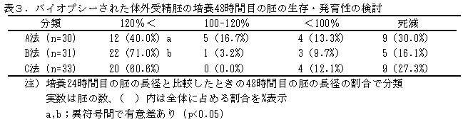 表3 バイオプシーされた体外受精胚の培養48時間目の胚の生存・発育性の検討