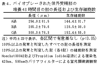 表4 バイオプシーされた体外受精胚の培養48時間目の胚の長径および生存細胞数