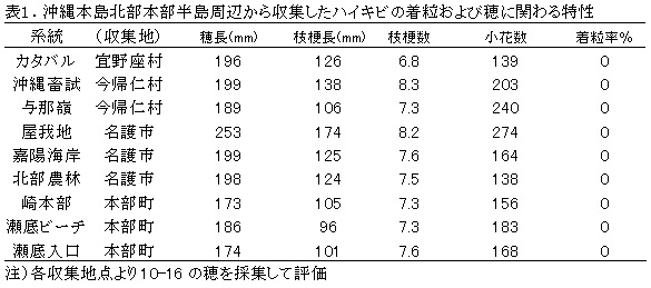 沖縄本島本部半島周辺地域から収集した系統の着粒および穂の形態は、収集地点により穂の大きさおよび小花数に差がみられるものの、いずれの系統も種子の着粒は認められない(表1)。