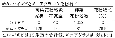 花粉稔性においては、ギニアグラスが80%の稔性を示したのに対して、無作為に選んだ13系統のハイキビでまったく充実した可染花粉がみられず、不稔である(表3)。
