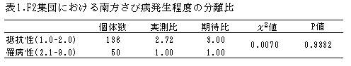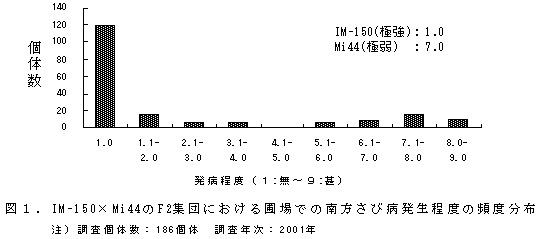 育成自殖系統で南方さび病抵抗性極強のIM-150と極弱のMi44に由来するF2集団における南方さび病発生程度の圃場評価の結果(図1)を、評点1.0-2.0を抵抗性、2.1-9.0を罹病性とすると、抵抗性:罹病性=3:1と一致する(表1)。これは、IM-150の抵抗性が優性の1遺伝子によることを示す。