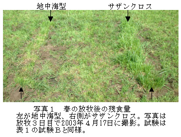 地中海型トールフェスクの放牧後の残食量は既存品種より少なく、家畜の嗜好性は高い(写真1)。