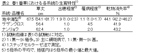 地中海型トールフェスクは、春1番草において既存品種に比べて網斑病などの罹病程度が小さく、乾物消失率が高い傾向にある(表2)。
