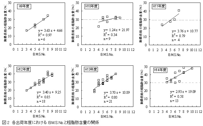 図2 各出荷年度におけるB.M.S.No.と粗脂肪含量の関係