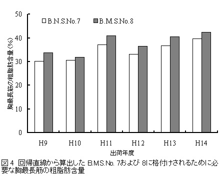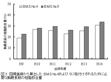 図3 回帰直線から算出したB.M.S.No.4および5に格付けされるために必要な胸最長筋の粗脂肪含量
