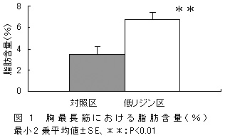 背脂肪厚に有意な差はみられないが、胸最長筋(ロース)の脂肪含量は、対照区の3.5%に対し、低リジン区が6.7%となり、約2倍にまで高くなる(表2、図1)。