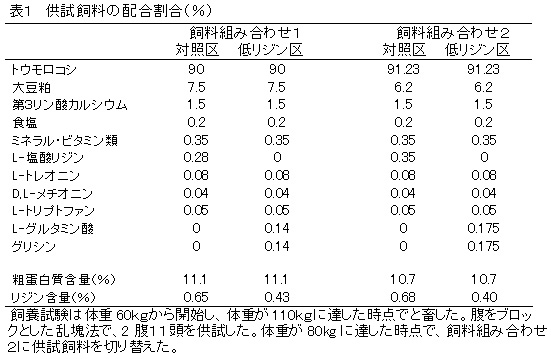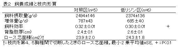 1日あたりの飼料摂取量と増体量は、低リジン区がそれぞれ120gおよび100g程度低くなり、飼料効率も低リジン区が低くなる傾向を示す。ロース芯面積には差はみられない(表2)。