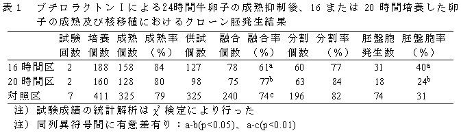 表1 ブチロラクトンIによる24時間牛卵子の成熟抑制後、16または20時間培養した卵子の成熟及び核移植におけるクローン胚発生結果